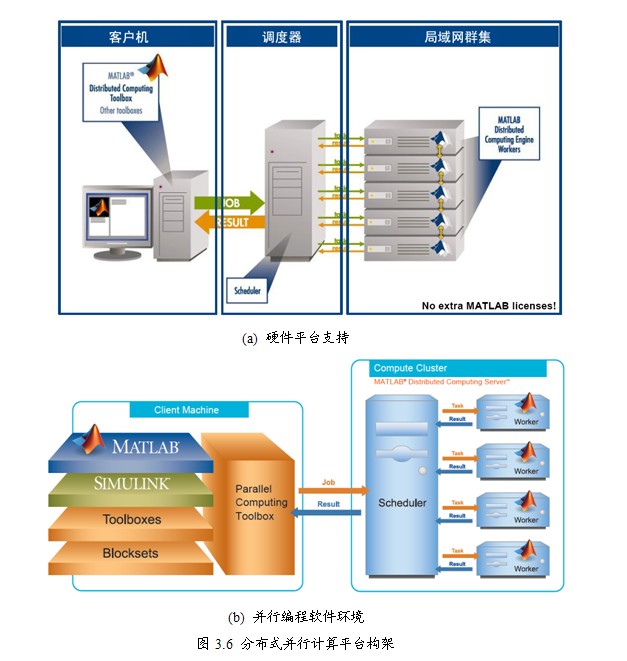 安装完毕后在双击主节点机的matlabrootflexlm文件夹下的lmtool.exe(matlabroot表示matlab软件的安装目录,下面不再作说明),开启Matlab License Server。 其他节点机除了无须再安装License Manager外,其他步骤大致与主节点机相同,整个详细安装步骤不再赘述,可参考MATLAB® & Simulink® Release 2008b Installation Guide for Windows®和Installing MATLAB® Distributed Computing Server™ 4.0 on a Windows® Operating System Cluster,如果出现错误,仔细排查并认真查看文档和在线支持。成功在不同机器上安装好 #p#page_title#e#MATLAB相关产品和工具箱并配置分布计算环境是重要的一步也是必不可少的一步,网络机群本身无法进行分布并行计算,并行程序开发和应用很大程度上依赖软件和算法的支持。 MDCE配置 如果存在旧的mdce服务,则要先停止,打开DOS命令窗口,输入cd oldmatlabroot oolboxdistcompinwin32,输入命令mdce uninstall,并删除相应日志和检查文件C:TEMPMDCE,其它机器上如果存在旧的安装同样方法移除。安装并开启新的mdce服务,同样在DOS命令窗口输入cd matlabroot oolboxdistcompinwin32,切换到新的mdce目录,输入命令mdce uninstall即安装mdce服务,mdce start启动服务,其他机子上重复这个过程这样所有机器上都启动了mdce服务,以后每次重启开机都会随系统自动运行。 首先在任一台机器上开启调度管理器(Job Manager),进入DOS命令窗口,用cd 命令切换到matlabroot oolboxdistcompinwin32,启动JobManager语句格式为:startjobmanager –flags ,flags为操作标记,如表3.3所示 如startjobmanager -name MyJobManager 即在本地机器上开启一个名为MyJobManager的作业管理器,startjobmanager -name myjm -remotehost SQY 则是在主机SQY上开启一个名为myjm的作业管理器。这个过程要保证网络畅通互连,并各机器运行mdce服务。在集群上可开启多个Job Manager,但名称要唯一,不能重复。如果要停止一个作业管理器,则用stopjobmanager –flags 格式与上基本相同,不同重述。查看其运行状态可用语句nodestatus -remotehost <job manager hostname>,然后再开启worker,语句格式为start worker –flags ,flags为操作标记,如表3.4所示 如startworker -name worker1 -remotehost bug -jobmanager myjm -jobmanagerhost SQY 即在节点机bug上开启一个名为worker1由主节点机SQY上名为的myjm调度器进行管理,一台机器上可开启多少worker,一个较好的原则是其个数不应超过这台机器处理器内核个数,多了无益,性能也不会有多大提升。如果要停止某一台机子上的worker,则用语句stopworker –flags,flags标记同表3.4。 只要保持各台机器网络互连、解除防火墙相应程序和端口的阻止及mdce服务的正常运行,这些命令可在任一台机器上执行,完成整个的集群配置工作。用nodestatus -flags命令可查看各机器上Job Manager和worker的运行状态。下图3.8所示,在主节点(服务器节点)SQY的主机上有一个名为myjm的作业管理器,管理局域网8个worker,且在主节点机上运行有2个worker。 MATLAB还提供了图形用户界面Admin Center 来管理集群机器,点击MATLAB主菜单“parallel”下的“Admin Center”,即可进入管理中心图形用户界面,可以载入建立好的局域网集群,查看、编辑和添加节点机,如图3.9所示,进行客户端机器、节点机之间的连接、端口及主机名一致性等测试,最后给出测试结果,如图3.10所示。在测试前注意先关闭防火或设置相应的例外程序和端口,不然可能会出现各节点机连接测试失败的情况。 上节已经介绍了软件安装配置的一个过程,总的来说如下图所示: 计算环境搭建好了,下面对各个计算节点作一个简单的测试: 计算平台性能测试是一个重要的环节,通过MATLAB提供类似Linpack的标准测试程序[56](MATLAB Benchmark),包括大型稠密矩陈LU分解、快速傅立叶变换(Fast Fourier transform,FFT)、解范德波尔方程(van der Pol equation)、解对称稀疏线性系统及2D,3D图形显示,表3.6所示。测试程序主要针对特定的MATLAB版本在不同机器的浮点运算性能(Floating-point)、规则和不规则存储、数据结构、整点和浮点混合运算性能等出对比。 #p#page_title#e#后两项图形测试不是本节主要测试内容,为附带测试,对前四项作简要介绍 对上面测试程序在节点机上连续4次运行,在MATLAB命令窗口输入>>t=bench(4),得到如下结果,各程序运行计算以秒(second)记,图3.11 (a),(b)给出了本台机器测试结果与其他不同操作系统和处理器主频下相同MATLAB版本的对比情况,测试结果与操作系统类型,处理器主频,开启的线程数,内存大小等有关,从中可以看出本机的浮点计算,规则及不规则存储等方面的性能,各次测试结果在5%到10%之间浮动是正常的,因为不同时刻的内在和CPU使用率是有所变化的,这里不再给出细致的比较分析 (a)测试程序运行时间对比 (b)测试程序运行相对速度柱状图 图3.11 测试程序运行时间及对比 由于其他两台机器与主节点机配置一样,不再单独测试,下面是前四个测试程序对集群分布式计算进行测试,测试结果如图3.12所示,由于集群各计算中各个时刻CPU、内在使用率和网络通信延迟等因素存在差异,因此在集群计算过程中,要考虑的因素主要有通信技术、负载均衡(指分配到各个处理结点上并行执行的子任务即负载的均衡程度)、并行粒度、安全等